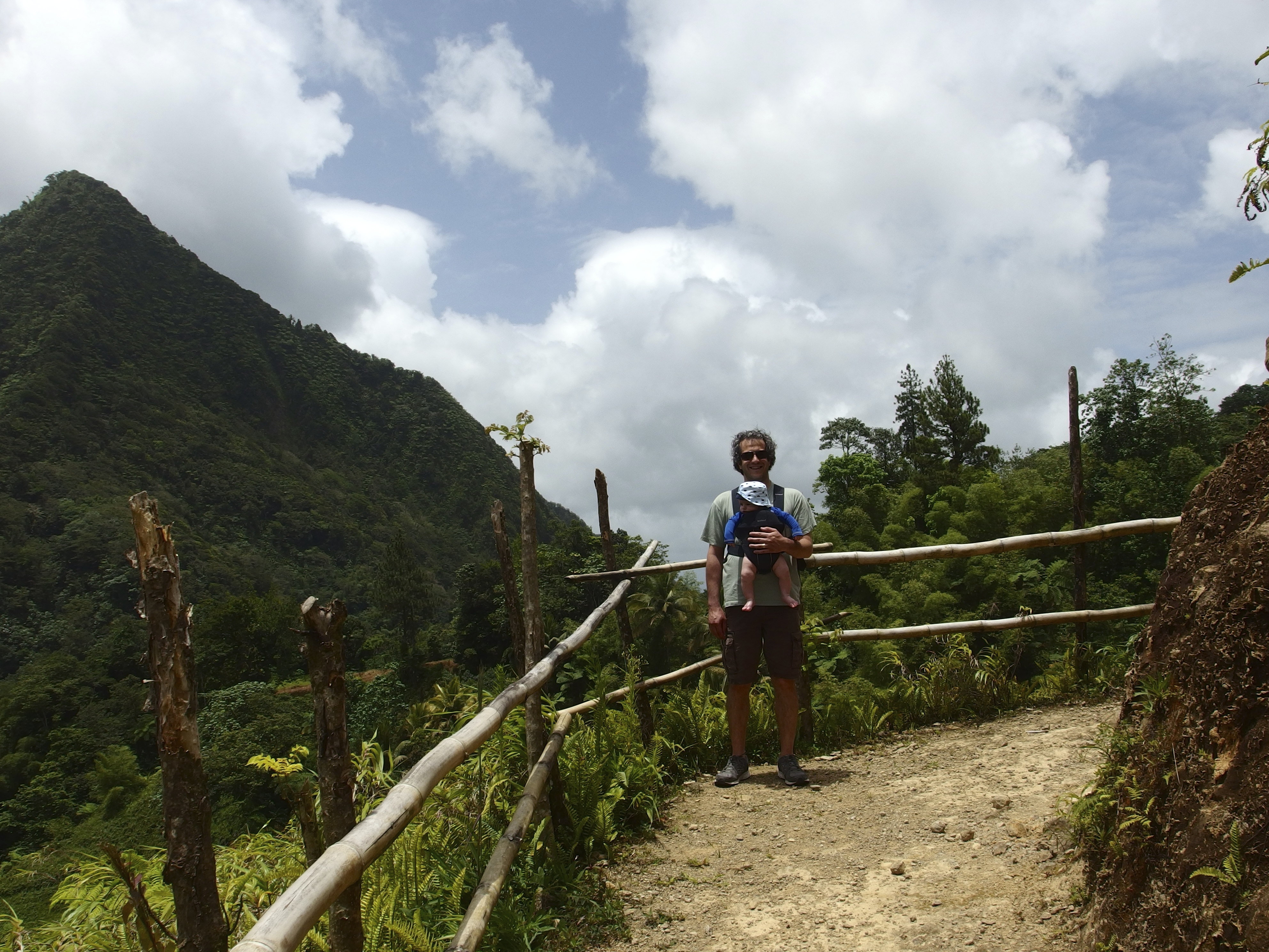 We got to the hotel, unloaded once again, grabbed a bite to eat, and it was then off for our first adventure. We went for a hike on a trail called En Bas Saut. It was a pretty cool trail. We went up and down several times. Walked along edge of cliffs. Saw some neat flowers and some amazing views of Mount Gimie. By the end of the hike I was done. I was securely strapped into Pa so nodded off for a while.