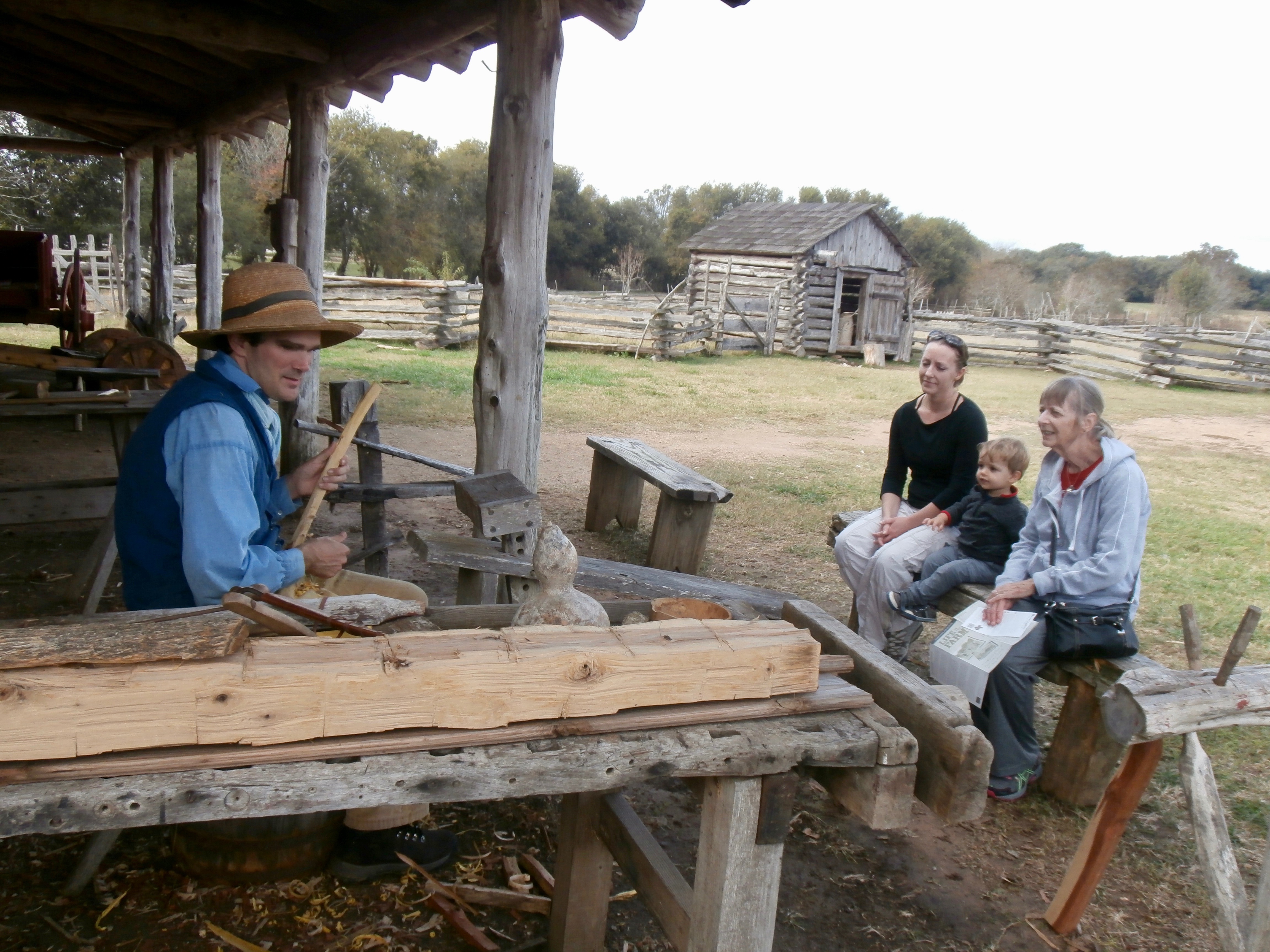 There was also a living farm on the property. The farm was owned by the last president of Texas, Dr. Anson Jones. The folks there follow his diaries and books so that they can recreate the daily activities from the farm in the 1850s. There was a lady out gardening, and when we showed up, she went over grabbed some of the chickens so I could pet them. I even helped water some of her plants. There was a man who was repairing some of the equipment that they use each day. Unfortunately, he said that the ox they use in the fields was not there that day.